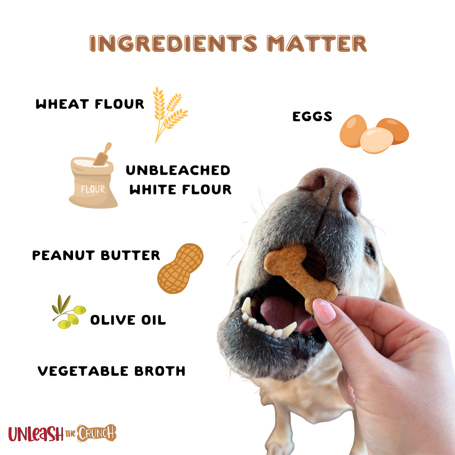 Ingredients: wheat, unbleached white flour, dog-safe peanut butter, vegetable broth, olive oil and eggs