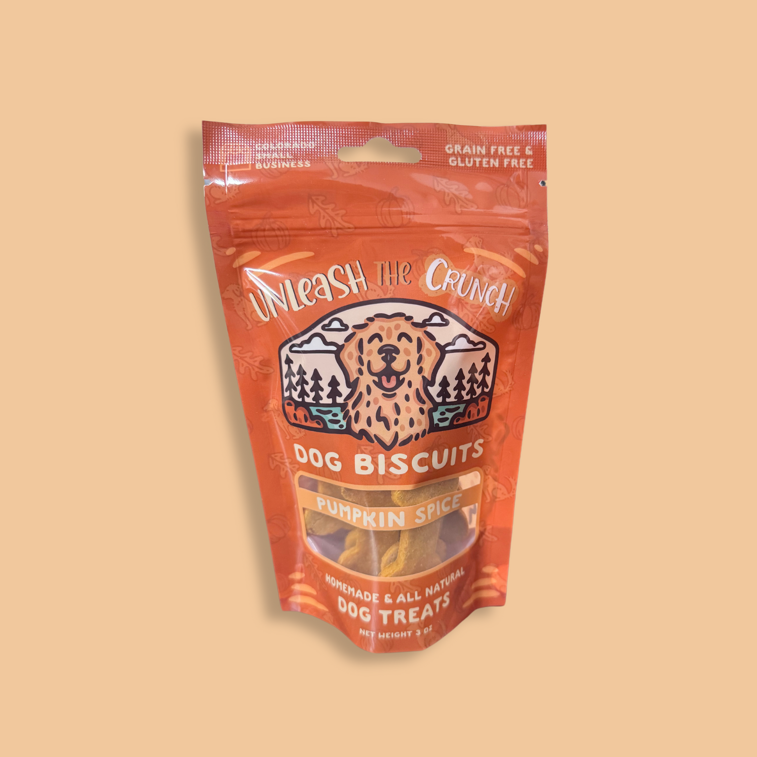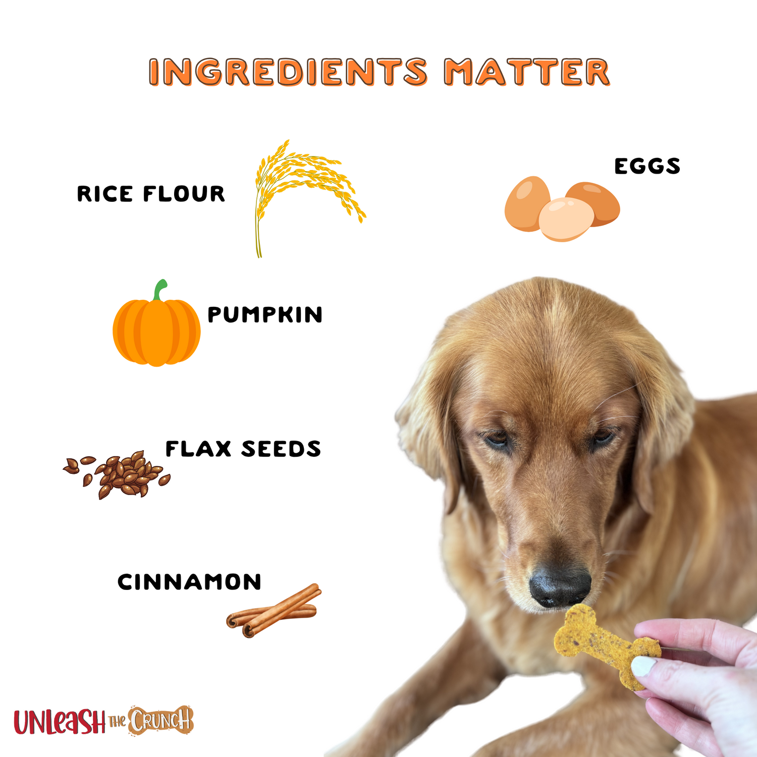 Ingredients: rice flour, flax seed meal, pumpkin puree, eggs, and cinnamon (100% GRAIN FREE & GLUTEN FREE)
